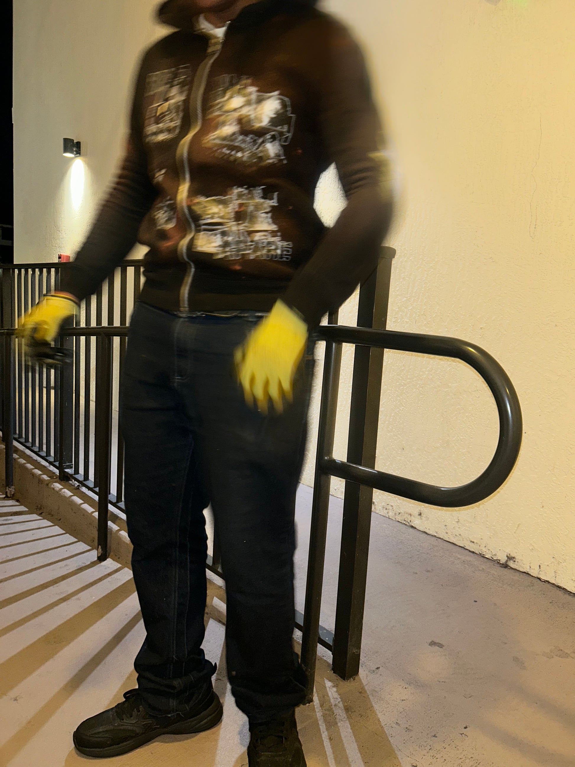 Hooded long-sleeve sweatshirt. Normal trim. Front zip closure. Dense pockets and picture print on front.